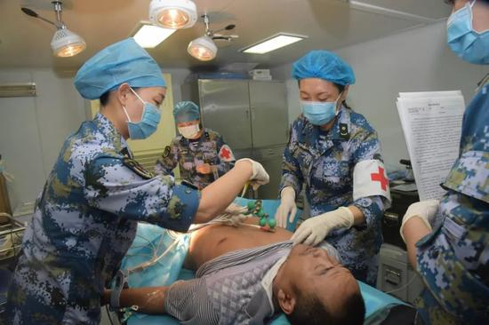 医护人员正在为受伤渔民进行手术治疗。