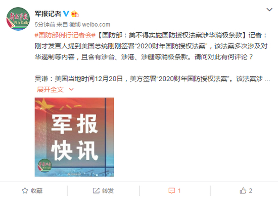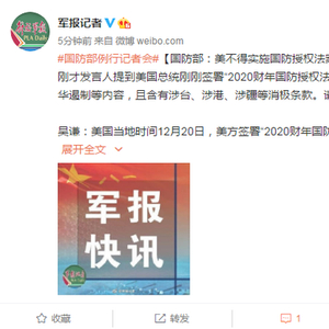 吴谦:美国当地时间12月20日,美方签署“2020财年国防授权法案”。该法案涉华内容充斥冷战思维,渲染中美竞争,炒作所谓“中国军事威胁”,包含涉台、涉港、涉疆等多项消极条款,粗暴干涉中国内政,严重违反一个中国原则和中美三个联合公报规定,破坏中美两国两军关系发展,损害中美互信与合作。中国军队对此坚决反对,中方已向美方提出严正交涉。