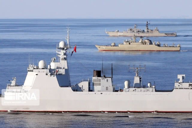 中国、俄罗斯、伊朗三国海军联合军事演习已经进入了第二天。中国人民解放军海军“西宁”号导弹驱逐舰,俄罗斯海军11540型护卫舰“智者雅罗斯拉夫”(777),伊朗海军轻型护卫舰“阿尔博兹”号(72)和护卫舰“巴扬多尔”(81)编队航行 。 (来自:环球时报军事)
