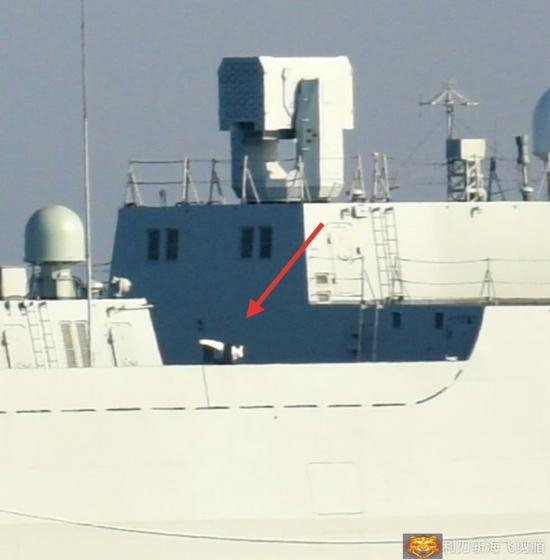 从“银川舰”尾向能清楚的看到,筒状物体是左右对称安装在直升机库两侧的,也就是说数量有4具。据分析,该物体的作用为诱饵发射装置,与英美海军战舰使用的MK59充气式漂浮诱饵应该是一样的。