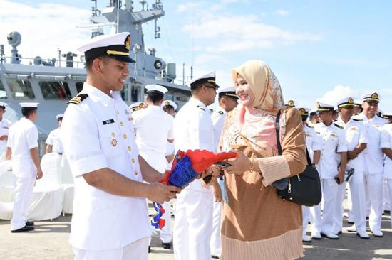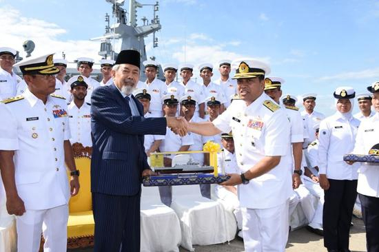 1月17日,由中国马来西亚海军最新建造的“短剑”号濒海任务舰,从江苏启东返抵沙巴州亚庇港海军基地,当地军民举行了隆重的欢迎仪式。