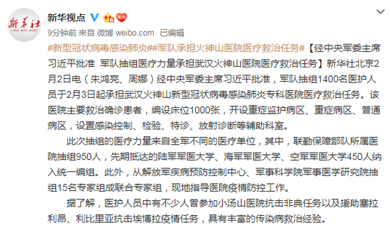 新华社北京2月2日电(朱鸿亮、周娜)经中央军委主席习近平批准,军队抽组1400名医护人员于2月3日起承担武汉火神山新型冠状病毒感染肺炎专科医院医疗救治任务。该医院主要救治确诊患者,编设床位1000张,开设重症监护病区、重症病区、普通病区,设置感染控制、检验、特诊、放射诊断等辅助科室。