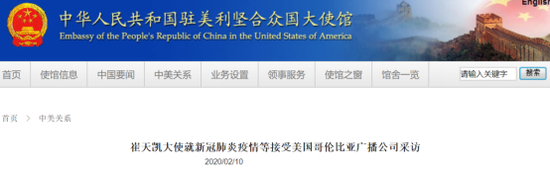 中国驻美大使崔天凯接受CBS采访 图源:中国驻美国大使馆官网