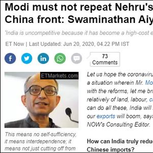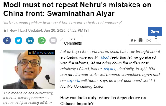 印度主流的英文大报《经济时报》6月20日刊发了印度著名经济学家斯瓦米纳坦·艾亚尔(Swaminathan Aiyar)题为《莫迪决不能重蹈尼赫鲁在中印边境的覆辙》的文章。文章明确反对要对中国发起军事报复的论调,认为莫迪政府不能重复尼赫鲁在1962年发动军事冒险行动的错误。“今天中印两军势力对比是1962年的5倍,如果贸然行动,我们会遭受五倍于当年的羞辱”。