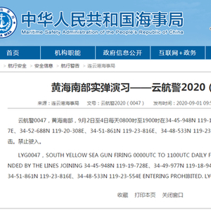 云航警0047,黄海南部,9月2日至4日每天0800时至1900时在34-45-948N 119-19-728E、34-49-977N 119-18-947E、34-52-688N 119-20-308E、34-51-861N 119-23-816E、34-48-533N 119-23-554E诸点连线范围内进行实弹射击。禁止驶入。