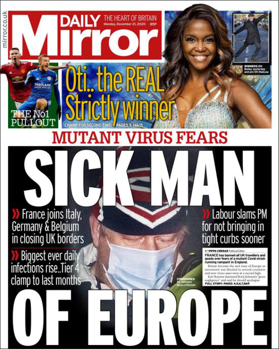 目前,法国、德国、意大利、荷兰、奥地利、瑞士、爱尔兰等众多欧洲国家,已经全面禁飞英国航班。英国《每日镜报》在头版打出标题,英国已成为“欧洲病夫”(SICK MAN OF EUROPE)。国际上,超30个国家和地区,发布了停止往来英国航班的政策。《泰晤士报》称,“欧洲对英国关上了大门”;美国消费者新闻与商业频道(CNBC)21日直言,英国成为“国际弃民(a global pariah)”。