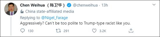 面对这种经典“西式双标”,陈卫华针锋相对,回复道“有侵略性?对待像你这样的特朗普式的种族主义者,不能太客气。”