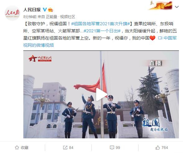 查果拉哨所、东极哨所、空军某场站、火箭军某部。。。#2021第一个日出#,当太阳缓缓升起,鲜艳的五星红旗飘扬在祖国各地的军营上空。新的一年,祝福你,我的中国。