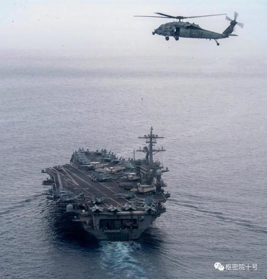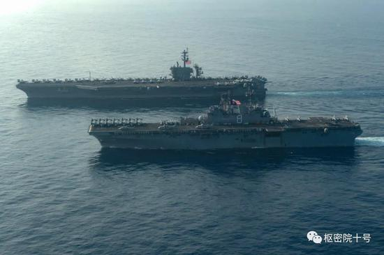 美国海军9日还发布了它与“罗斯福”号航母同框的亲密照。
