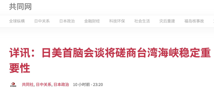 日媒:日美首脑会谈将提台海问题 可能写入联合文件
