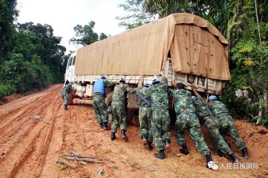 2006年6月2日,在利比里亚蒙罗维亚,中国驻利比里亚维和运输分队的士兵合力推动陷在泥泞中的车辆。