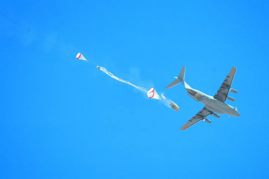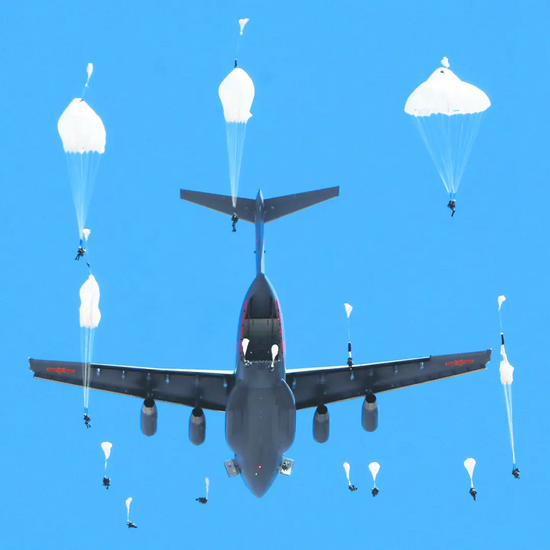 伞兵进行集群伞降。