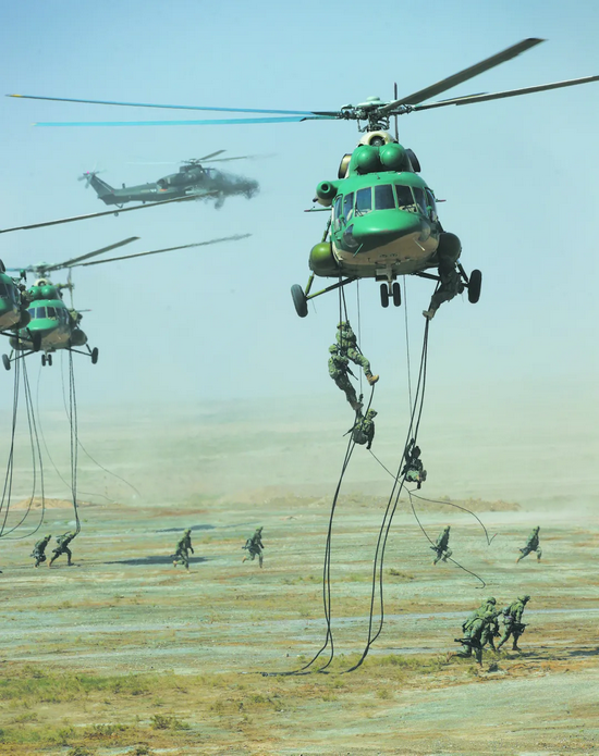分批轮进、精确打击、饱和轰炸……实兵演练中,在预警机的指挥下,我军歼-20、歼轰-7A、歼-16、歼-11战机以及俄军苏-30战机,对“恐怖分子”营地实施空中突击。超低空突防的直-10武装直升机,分批次按照品字队形跃升俯冲攻击。随后,地面炮兵群对“敌”实施全纵深、多方向、高强度、波浪式饱和火力突击,全面压制毁瘫“敌”作战体系。