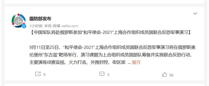 9月11日至25日,“和平使命-2021”上海合作组织成员国联合反恐军事演习将在俄罗斯奥伦堡州“东古兹”靶场举行,演习课题为上合组织成员国部队筹备并实施联合反恐行动,主要演练侦察监视、火力打击、外围封控、街区拔点,以及前出防御、地面突击、分割围歼、肃清残敌、抗击无人机袭击等课目。中方参演部队以北部战区为主,共派出550余人,出动车辆(装备)130辆。此次演习是上合组织框架内的例行性演习,旨在深化各成员国防务安全合作,提高应对新挑战新威胁能力,共同维护地区和平与安全。