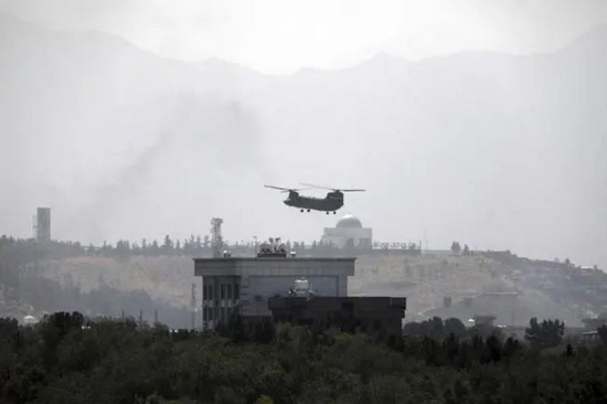 8月15日,阿富汗喀布尔,美军直升机抵达美国驻阿富汗使馆上空准备撤离使馆人员