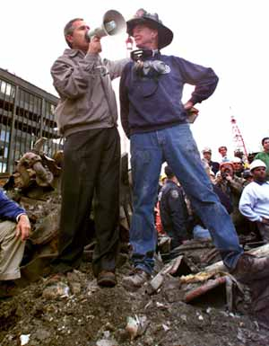 (小布什站在世贸中心大厦废墟上发表讲话)