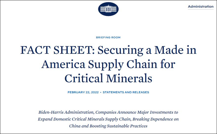 当地时间2月22日,在意图打造“去中国化”供应链的14017号“美国供应链”总统行政令签署即将一周年之际,美国总统拜登在白宫一场线上会议上,宣布对锂、石墨、稀土等关键矿物材料的国内生产进行重大投资,明确要“加强关键矿物的储备”,还提到中国对于稀缺矿产资源的“垄断”。