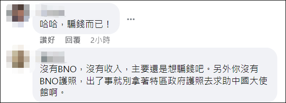 有网民嘲讽,“骗钱而已,搞得这么认真”“见好就收吧”“别到时候出了事,拿着特区政府的护照跑去求助中国大使馆”。