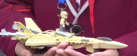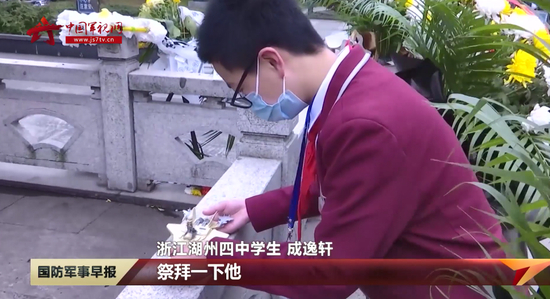 浙江湖州四中学生成逸轩:“王伟叔叔是‘海空卫士’,我一直想送他一个飞机模型,所以我今天就把这个飞机模型带过来,祭拜他。”