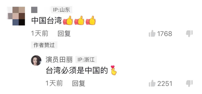 有粉丝为其视频中的“中国台湾”点赞,田丽回复对方,“台湾必须是中国的”。