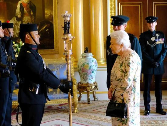 廓尔喀士兵在白金汉宫的仪式中向女王展示权杖
