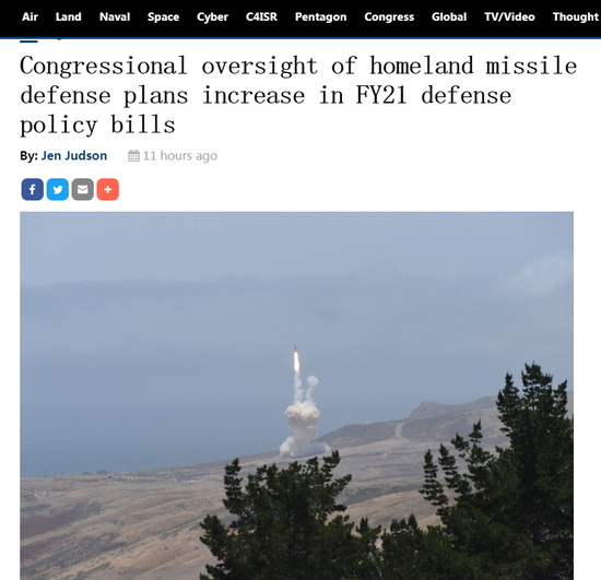 《防务新闻》在7月27日报道称,美国国会的参众两院正在通过《2021财年国防授权法案》加强对导弹防御局(Missile Defense Agency)“国土导弹防御系统”的监督。该系统的主要目的是防范朝鲜和伊朗的洲际弹道导弹给美国带来的潜在威胁。