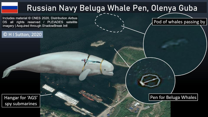俄罗斯海军另一个海洋哺乳动物训练基地是在北极。在那里,训练的主要是白鲸和海豹。当“赫瓦尔迪米尔”白鲸出现在挪威的同时,俄罗斯海军将一些白鲸移到了奥伦亚古巴潜艇基地(北纬69°13‘12.41“、东经33°23’4.72”),这是俄罗斯间谍潜艇的基地。白鲸体型比海豚大,速度慢,但似乎更适合北极环境。可以执行反蛙人行动。