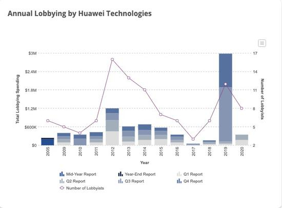 聊了这么多,说客一职,说到底就是用自己的人脉资源,帮助各行各业,在政府和政客之间“跑关系”。为了搞定这些美国政客,中国企业也难以逃脱游说的套路。彭博社曾报道,处在水深火热之中的华为公司,2019年第三季度游说费用高达180万,全年共花费300万美元。早在2012年,也就是华为上一次遇到类似危机的时候,也曾花费120万美元进行游说。危机解除后的几年,该项费用逐年下降,2017年只有6万美元,2018年则是16.5万。同样为行业巨头的德国汽车企业大众,从90年代开始,每年都稳定地支出100万美元左右的游说费用。与美国“亦敌亦友”的三星集团,从2012年的100万美元开始,每年游说费用都在增加,2019年超过340万美元。