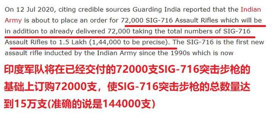 按照较新的外媒描述,印度将从美国购买西格绍尔公司生产的“SIG 716步枪”,并将这些新枪装备给正在边境前线同中国对峙的部队。也有部分媒体披露,这些枪实际上已经是第二批了,印度总计将装备约14.4万支SIG716步枪。