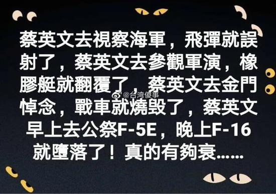 虽说上回F-5E因为弹射高度太低,弹射座椅性能又不行,所以落水时人就快不行了,这回F-16A目前看甚至都没有飞行员弹射的迹象,所以即使搜救及时,也未必就能把这二位救回来;但正如此前F-5E坠机时我们说过的,分析这类事故里台伪公布的种种细节,总能让我们找出台伪空军存在的具体短板。而从娱乐的角度上说,这让岛内关于蔡英文“去哪哪出事”的段子集里,又多了新的“战绩”。