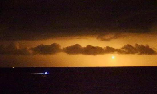 ▲C-130投下的照明弹虽然能让一片天空亮如白昼,但对海面的照亮效果仍然有限;海上的亮光则是“海巡署”出动的小艇