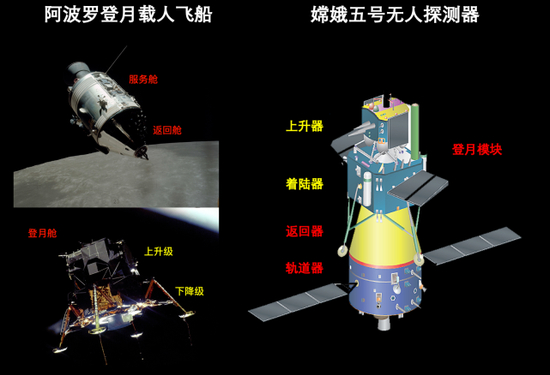 如果你仔细观察,就能发现嫦娥五号探测器的模块划分与当年的阿波罗飞船类似,后者具有包含下降级和上升级的登月舱、相当于嫦娥五号轨道器的服务舱,以及相当于返回器的指挥舱。两者的登月与返回程序也基本类似,只不过阿波罗的登月舱上升级升空与母船对接后会被立即抛弃。