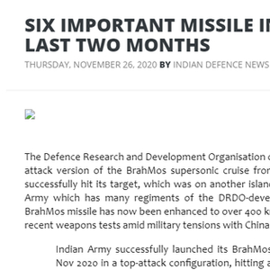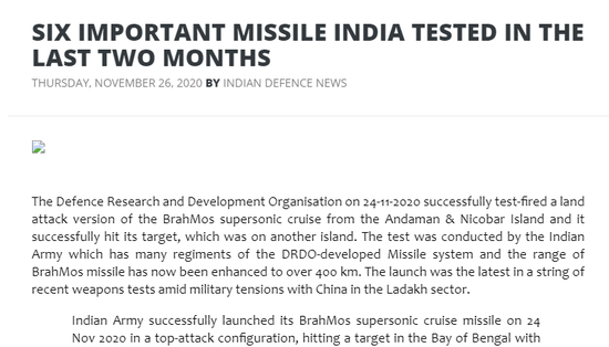 据《印度国防新闻》网站报道,印度国防研究与发展组织于2020年11月24日在安达曼和尼科巴岛试射了一枚“布拉莫斯”超音速巡航导弹,并成功击中了另一个岛屿上的目标。此次发射也是中印在拉达克地区关系紧张之际,印度一系列武器试验中最新的一次。