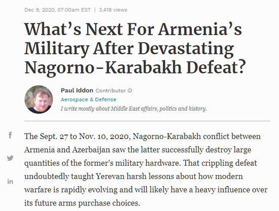 据美国媒体《福布斯》网站报道,在2020年9月27日至11月10日进行纳卡冲突中,阿塞拜疆成功摧毁了亚美尼亚的大量军事设施。这场惨败无疑给亚美尼亚深刻的教训,并可能对其未来的武器采购选择产生重大影响。