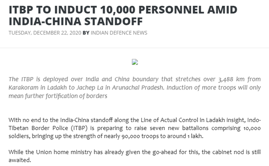 消息人士表示,印度边境部队将招募近1万名新兵,以守卫敏感的印度北部边界。这支部队部署在中印边境地区,而征召更多的兵力,只会意味着印度要进一步加强边境兵力部署。一名了解事态发展的印度官员表示,目前中印实际控制线正逐步成为了一条新的“印巴控制线”,当务之急是进一步加强与中国人的长期对峙。