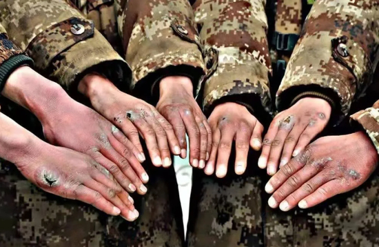 而在千里外的喜马拉雅北麓,记者们记录下了塔克逊哨所一群边防战士的手。7只手满手冻疮和血泡,没有一只是完好的,惨不忍睹。