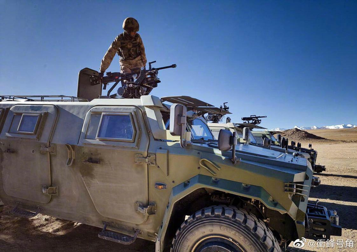 随后这支精锐力量分别登上两台热车完毕的第三代猛士装甲突击车(CSK181),向涉事区域进发。三代猛士车宽2.4米长5.6米,载重1.8吨,可乘坐10人班组,配备防弹玻璃、防弹车身可抵御部分小口径武器射击,轮胎在被打穿的情况下仍然可以继续行驶30公里。三代猛士配备了300马力柴油机,涉水1.2米,车顶可架设12.7毫米高射机枪、35毫米榴弹发射器,可以在高原山地条件下执行兵力输送、穿插作战等任务。视频中任务分队搭乘的两台三代猛士可能按照我军双车作战分队的惯例采取了高射机枪+榴弹发射器的搭配方式。具有强大的反步兵火力,具备一定的反轻装甲战斗能力。