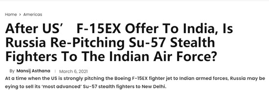 据印度媒体《欧亚时报》网站报道,在美国向印度武装部队大力推销波音F-15EX战斗机的时候,俄罗斯可能正竭力向印度出售其最先进的苏-57隐形战斗机。