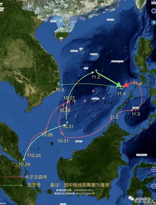 而海自的“加贺”号直升机航母则一路向北,一直航行到了南沙群岛以北,中沙群岛以南的海域。
