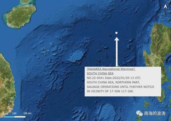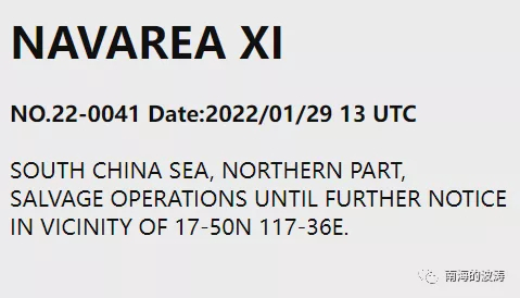 大意为:南海北部,在17°50′N、117°36′E附近海域进行打捞作业,直至另行通知。
