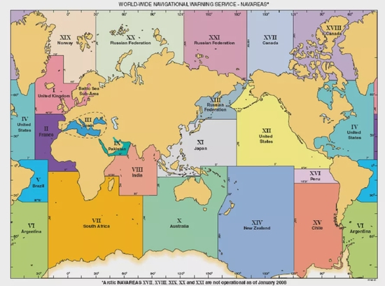 政府间海事协商组织和国际海道测量组织的全球无线电航行警告业务World-Wide Navigational Warning Service(WWNWS),将全球海域划分为16个航行警告区,以“NAVAREA+罗马数字”表示。我国海域在第11航行警告区(NAVAREA XI)内。第11航行警告区包括中国、朝鲜、韩国、日本、越南、柬埔寨、泰国、马来西亚、新加坡、印度尼西亚、菲律宾、文莱、美属关岛等国家和地区。第11航行警告区的协调人员目前暂由日本负责,具体工作由日本海上保安厅负责。