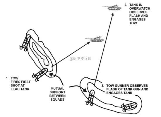 具体来说,就是将反坦克部队横向或者沿纵深部署,使得对手难以同时压制所有反坦克小组。一组受到攻击,别的组可以继续开火以杀伤和扰乱对手。