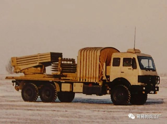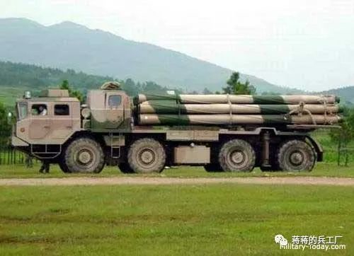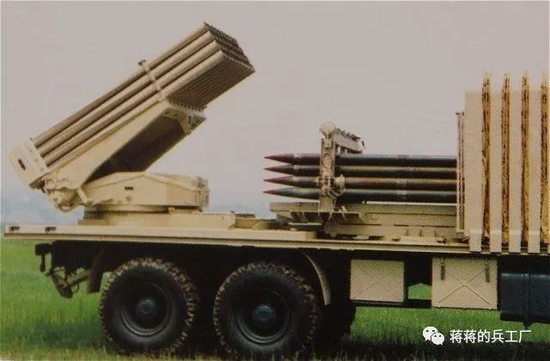 90B型122毫米火箭炮由北方工业研制,是90式改进型,2003年研制完成。该车采用北奔NG 2629型6X6轮式底盘,长9.31米,宽2.49米,高3.02米,战斗全重23吨,最大公路速度85千米/小时,最大航程800千米。该型火箭炮采用40管122毫米发射器,其高低射界0-55度,方向射界-102至+102度,还配备有40枚备用火箭弹架升降与装填装置,通过驾驶室内遥控在3分钟内装填完毕,再次齐射,可谓是模块化出来之前的最好设计。有趣的是该车还设计了液压折叠式迷彩篷布架,可罩住整个火箭炮发射部分伪装货车,用时1分半钟,火箭炮作战准备时间7分钟。