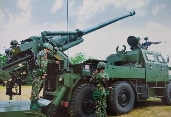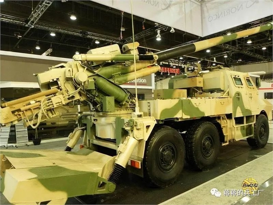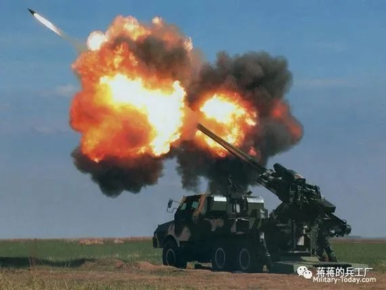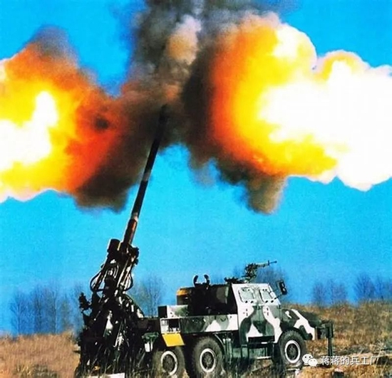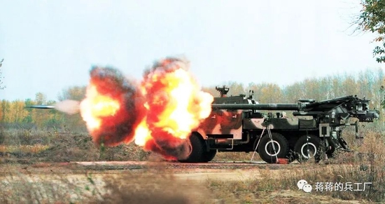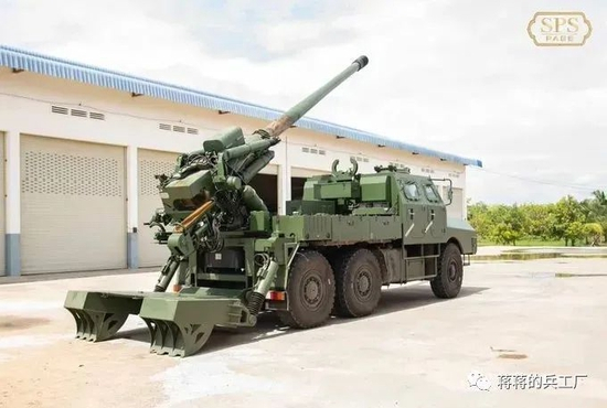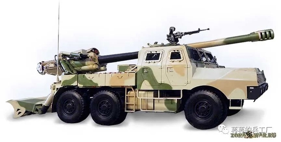 SH1型外贸155毫米卡车炮2002年开始研制,2006年设计定型,2007年在阿布扎比防务展亮相。研制中受到了凯撒卡车炮的深刻影响,因此布局也类似。说实话该车我最不喜欢的就是他的底盘前脸,简直丑出天际,而且巨长。SH-1据说采用万山WS5252型6x6卡车底盘,安装一台330马力的柴油发动机,长9.68米,宽2.58米,高3.5米,其航程约600千米,侧倾坡度40%,涉水深1.2米,可跨1.2米台阶,最大公路速度在90千米/时,战斗全重22.5吨,安装有6人装甲驾驶室,可防轻武器与炮弹破片,顶部可安装12.7mmQJC88防空机枪。SH-1可以自动升降车尾驻锄和驱动火炮控制设备自动瞄准目标,其液压驻锄还兼做乘员的站立平台,可通过液压系统压入土中,即可稳固开炮,行军转换时间不到1分钟。